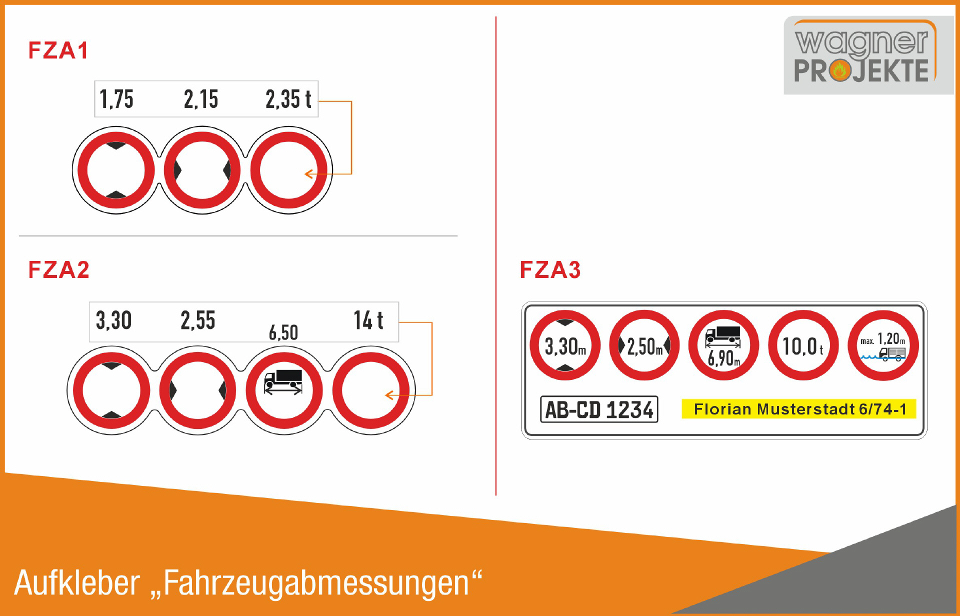 Drei Kreise für Fahrzeughöhe, Fahrzeugbreite und zulässiges Gesamtgewicht, gefertigt aus Marken-Digitaldruckfolie mit Lösemitteldruck und kaschiertem Schutzlaminat.