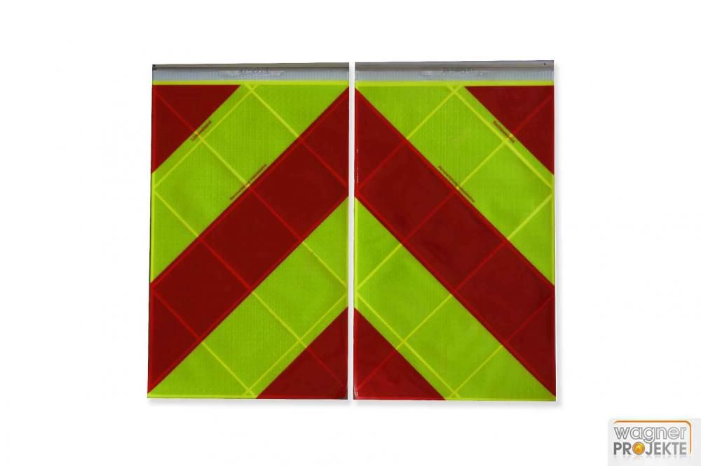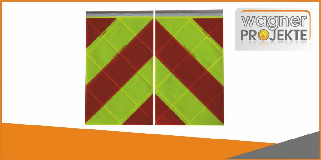 Lieferumfang: 1 Warnflagge rot/neongelb linksweisend, 1 Warnflagge rot/neongelb rechtsweisend, 2 Aluhalterungen, 2 Schrauben zur Fixierung der Fahnen im Halter