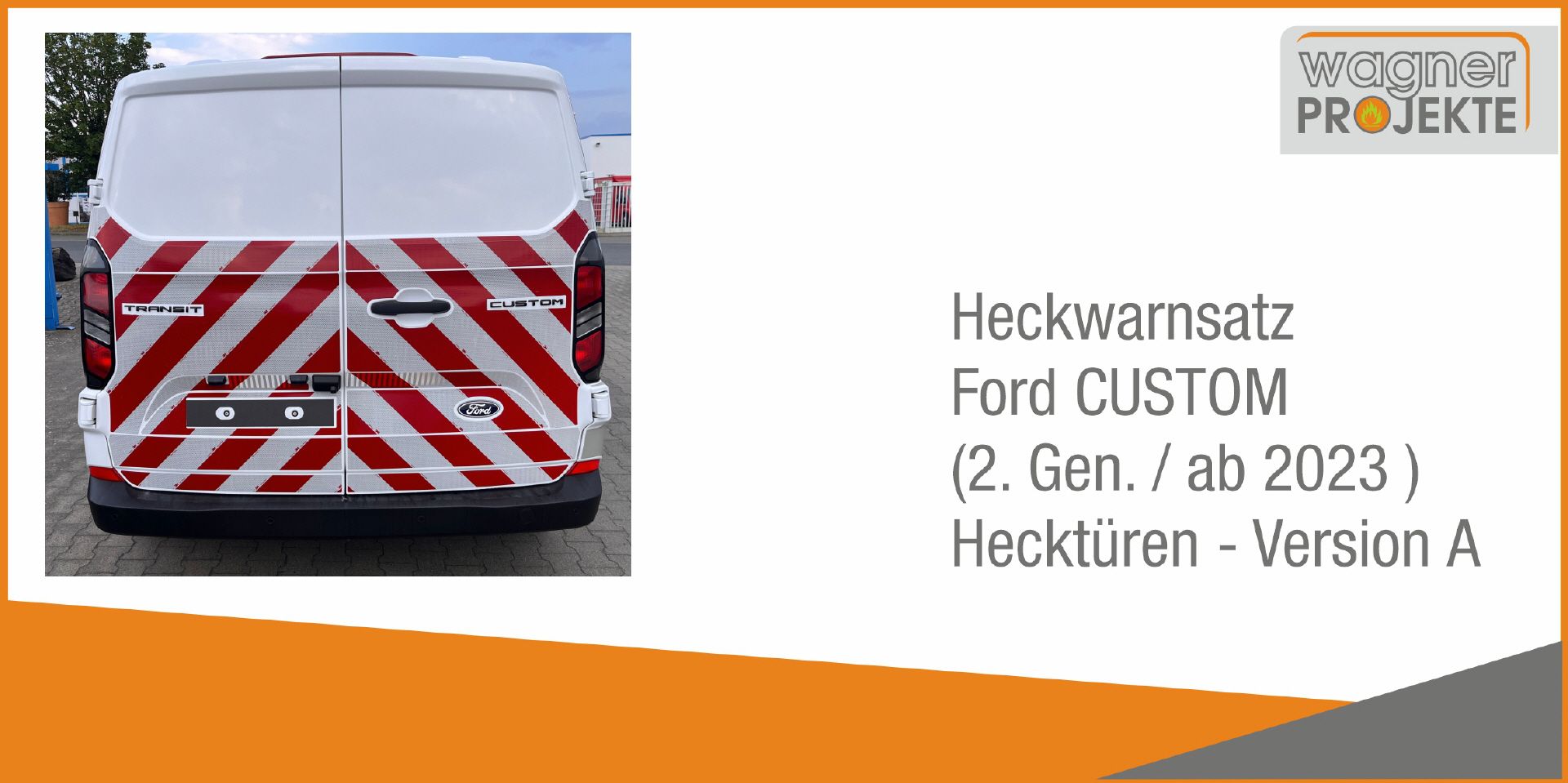 Ausführung auf Hecktüren unterhalb Scheibe, optional mit Kontureinfassung umlaufend. Heckwarnmarkierungssatz, verfügbar in den Farben rot/weiß reflektierend und rot/lime reflektierend.