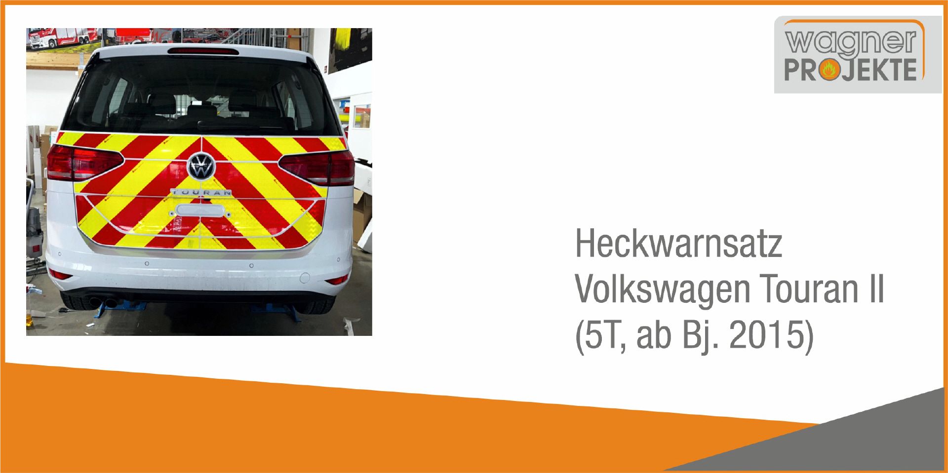 Die Heckwarnmarkierung ist wahlweise mit Ausschnitt für den "TOURAN"-Schriftzug, der bei den neueren Baujahren unterhalb des VW-Zeichen sitzt, verfügbar oder ohne Ausschnitt (für ältere Modelle bzw. Fahrzeuge, bei denen der TOURAN-Schriftzug entfernt werden soll).